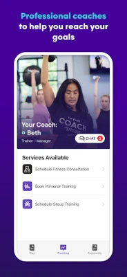 Coaching — Everyone needs a little help sometimes, and the Anytime app helps connect you with professional health coaching services. Our coaches pull in your current health info and learn about your goals and lifestyle information to create an ultra-personalized plan, just for you. The concierge in the Anytime app can also connect you to other services at Anytime Fitness, such as scheduling 1:1 personal training and group training classes, and much, much more!