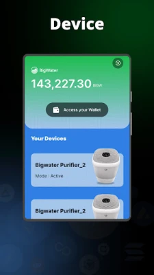 The BigWater app connects your BigWater Air Purifier to the web3 ecosystem. With it, you can register your device, track its contribution towards building a greener environment, and manage your digital assets including BigW tokens and NFTs