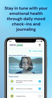 Precise Digital Youth is an app created to help teens and young adults take care of their mental health. It gives you tools to understand how you’re feeling and offers support that fits your needs no matter where you are. You’ll do quick check-ins, write in a journal, and get helpful videos, audio clips, and articles picked just for you. The app also includes coaching and step-by-step guides to help you handle stress, build good habits, and feel more in control. You can even share your results with a therapist to get extra support. Precise Digital Youth helps you feel better, one small step at a time.