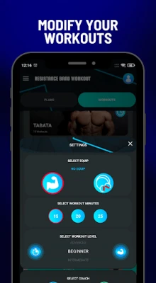 Push-ups, squats, abs, planks, crunches, squats on the wall, jumps, bumps, triceps jumps, lunges, more than 200 exercises without equipment and with rubber band.