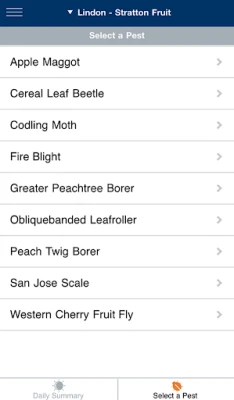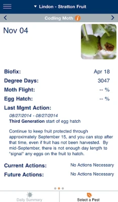 • Choose a pest you are concerned with, such as codling moth, peach twig borer, or western cherry fruit fly, and see pest emergence rates, treatment information, and a history of pest activity.
