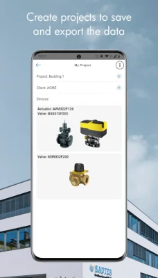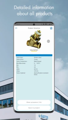 Selected product combinations can be created as projects and shared with customers or colleagues as tables in PDF format or by hyperlink via e-mail or message. If you need further information or specifications on SAUTER valves and actuators, you can also access them directly via the app, by means of links to the website.