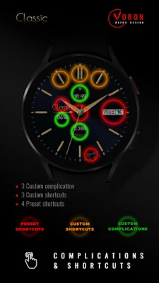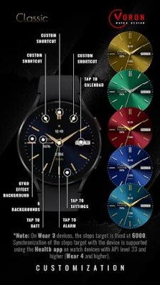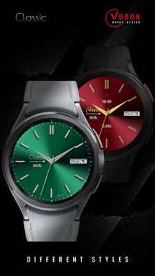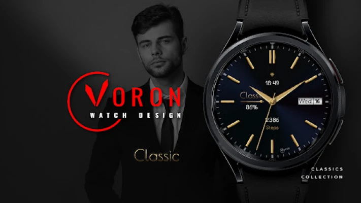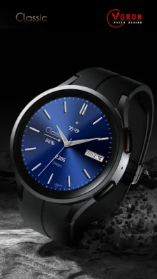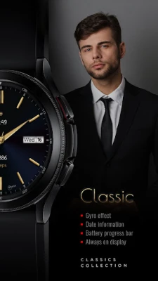 Classic analog watch face. Stylish and simple for an elegant look. Lots of combinations with gold and silver elements and various background colors. On the classic watch face, there is a constant and convenient battery indicator.